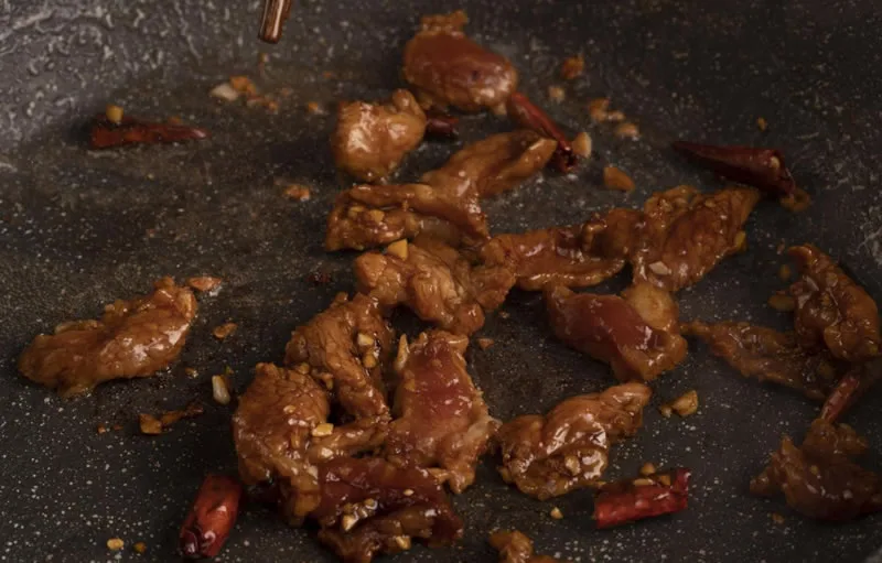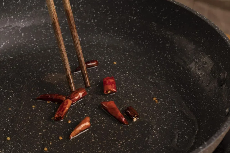 Stir-fry Aromatics: Heat some oil in a pan or wok over medium heat. Add the dried chili peppers and stir until fragrant.