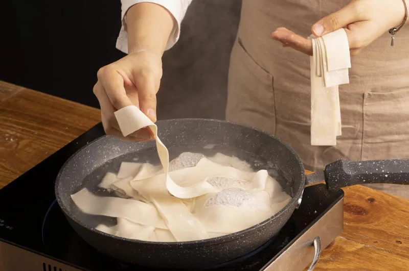 Cook the Noodles: Bring a large pot of water to a rolling boil. Add the torn noodles and cook for about 1-2 minutes until they float to the top.
