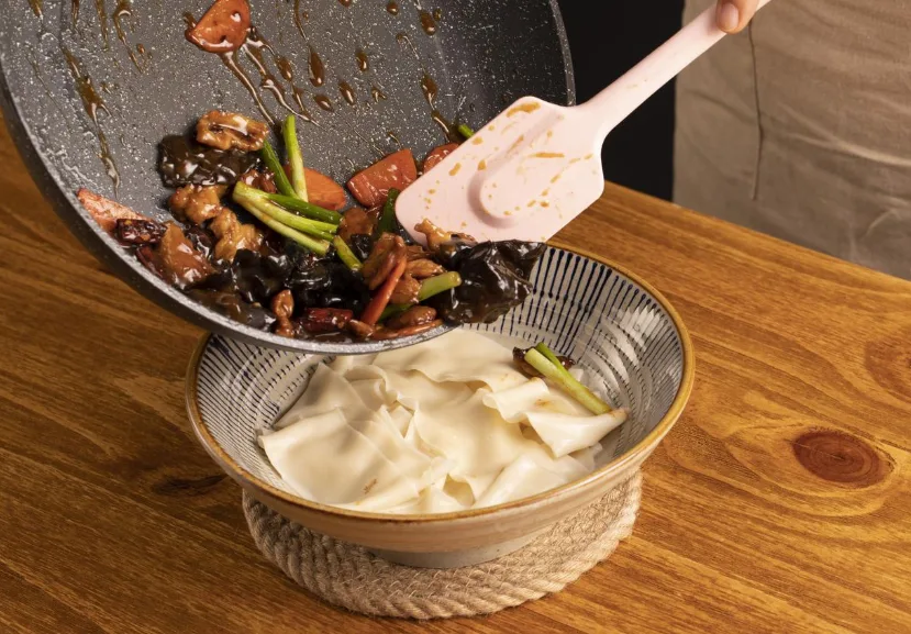 Spread the hot, savory topping evenly over your bowl of cooked scratch-made Biang Biang noodles.