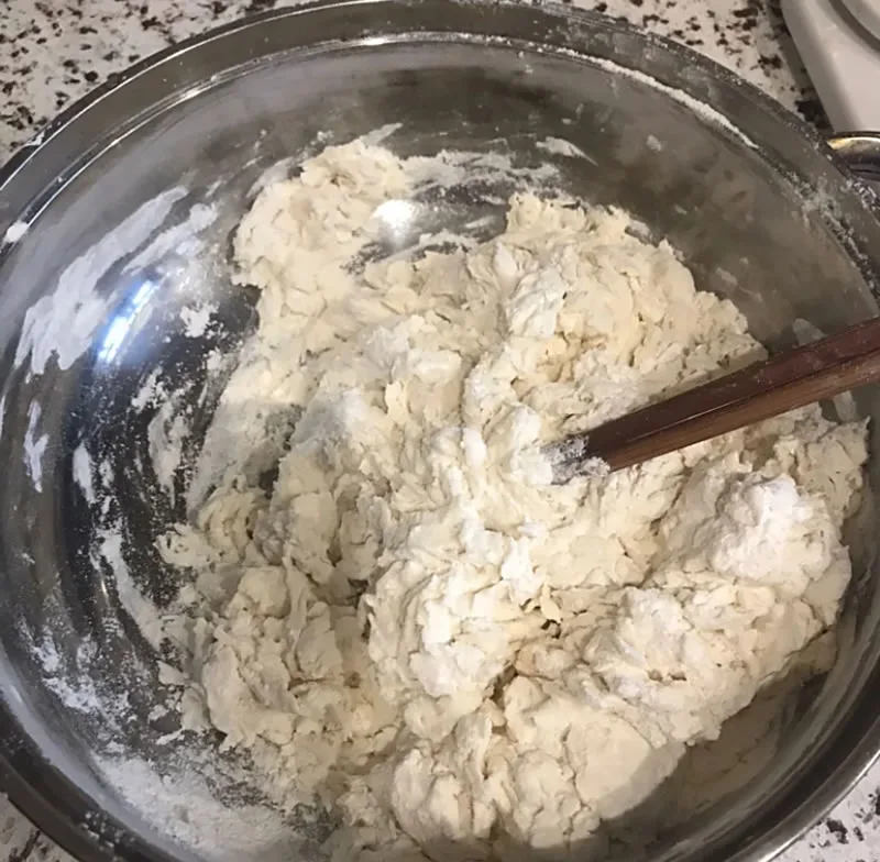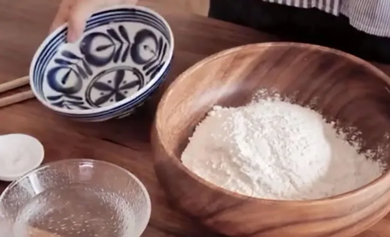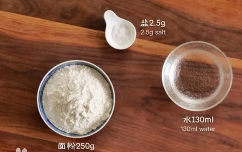 In a large bowl, combine 500g of flour with 5g of salt. Slowly pour in 260ml of water while stirring with chopsticks until the mixture forms small, flaky clumps.
