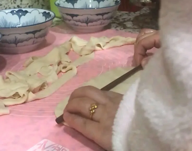 Take one piece of dough and press it flat into a strip. Use a chopstick to press a line down the center—this will help you split the noodles later.