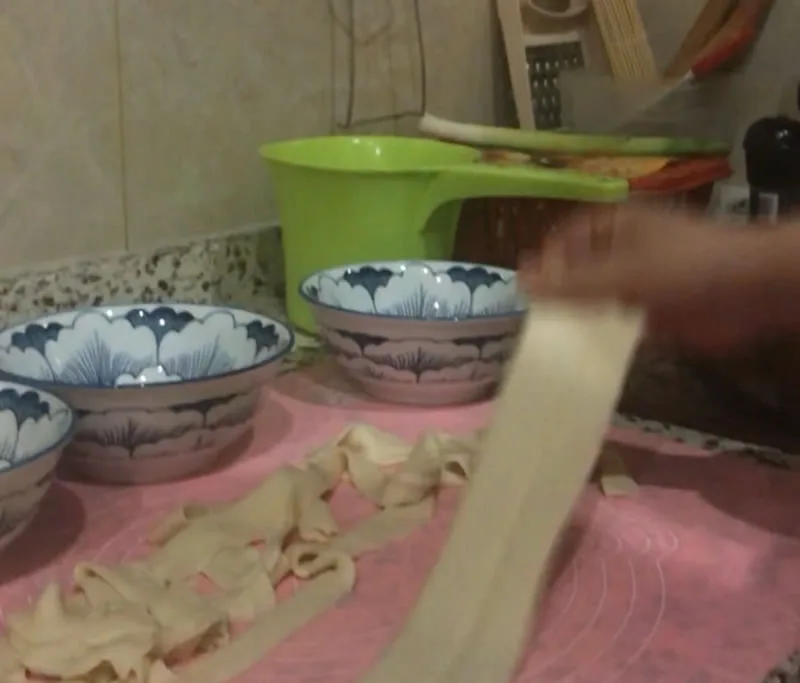 Hold both ends of the dough strip and gently stretch it while bouncing it against the counter. This is where the fun “biang biang” sound comes from! Stretch it as long as you can, then tear it along the chopstick mark into two long, wide noodles.